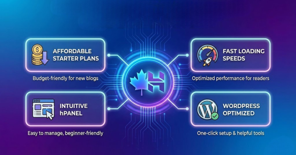 The performance reliability offered by Hostinger helps blogs load faster, which improves reader engagement and search engine rankings. For bloggers comparing Canadian hosting options, Hostinger offers the right balance of speed, simplicity, and affordability.