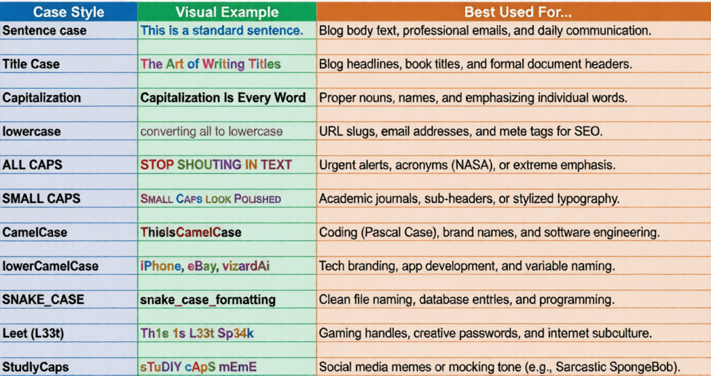 Formatting plays a bigger role than most people think because it directly impacts how the brain reads information. Text written entirely in uppercase feels aggressive and difficult to read, while text written entirely in lowercase feels incomplete and unpolished. On the other hand, a properly formatted sentence case feels balanced, clear, and professional. This affects reading speed, comprehension, and retention. For content creators, this means that better readability leads to better engagement and stronger results. This is why using the right case style is not optional but essential. Before I take you further, I’d like to show you the different case styles in the table below.